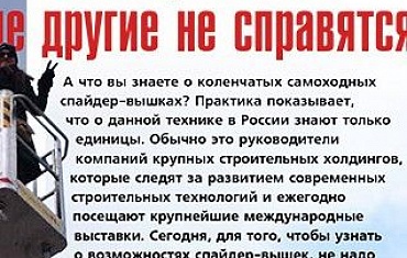 В начале года компания "Арлифт" подписала соглашение об эксклюзивной дистрибуции с одним из ведущих европейских производителей спайдер-вышек – компанией Bluelift. Это позволило приподнять завесу таинственности и подробнее узнать об уникальных возможноcтях этой техники.